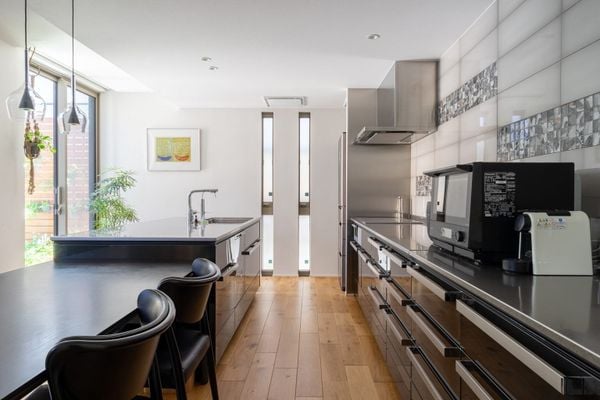 Vật liệu thép không gỉ x gỗ : Bằng cách kết hợp với vật liệu gỗ, không gian bếp sẽ thêm ấm áp và mềm mại, và có thể hoàn thiện thành không gian trang nhã